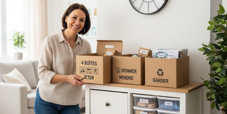 Commencez par un tri rapide et régulier. Réunissez quatre sacs ou bacs : 4 boîtes pour jeter, donner, vendre et garder. De plus, fixez-vous un périmètre précis : une étagère, puis un tiroir, puis une zone. En bref, un périmètre réduit évite la panne de motivation et accélère les résultats, grâce à ces astuces très concrètes.