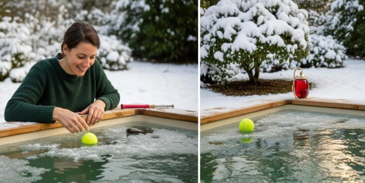 Déposez ensuite la balle sur l’eau et surveillez-la matin et soir. De plus, changez l’eau si elle blanchit, signe de gel imminent. Vous pouvez verser de l’eau tiède, sans ébouillanter, pour libérer la surface. Par conséquent, l’accès reste possible pendant les heures les plus froides.