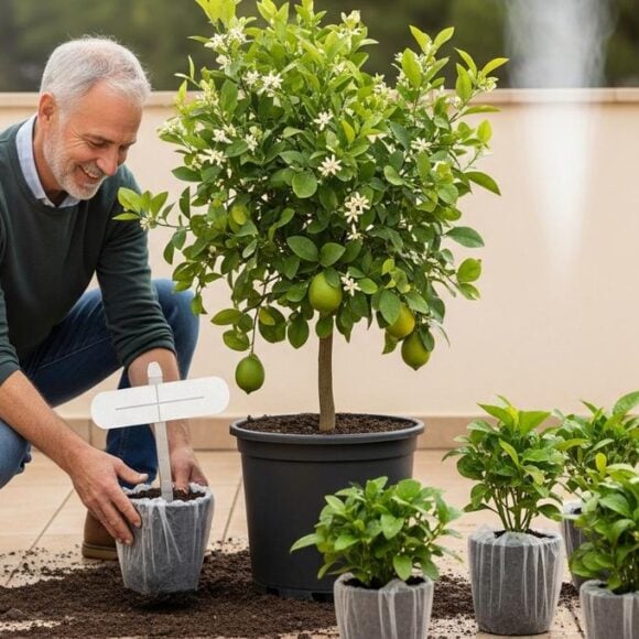 Citronnier en pot: plantez des couverts en plastique pour empêcher le grattage du terreau et protéger les racines